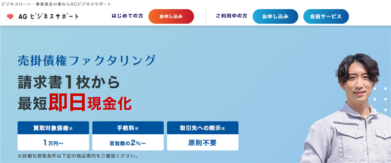 | AGビジネスサポート | 非公開 | 最短即日 | 法人・個人事業主 | 上限なし | ◯ |
