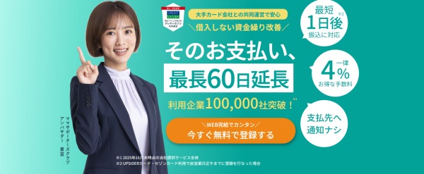 | 支払い.com | 4% | 最短1日後 | 法人・個人事業主 | 1万円~上限なし | ◯ |