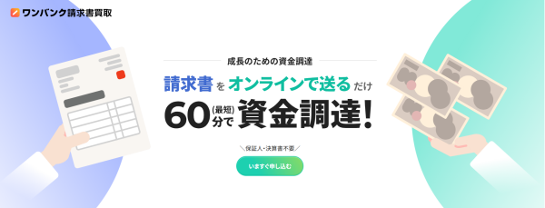 | ワンバンク請求書後買取 | 非公開 | 最短即日 | 法人・個人事業主 | 要問合せ | ◯ |